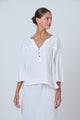 This pintuck blouse transcends everyday wear with its thoughtful design philosophy. Delicate pleating and a structured button front establish refined elegance, while cropped balloon sleeves and a shirred neckline introduce contemporary femininity. Constructed from 100% crinkle cotton, the fabric's inherent texture creates a semi-sheer, lightweight quality that drapes with natural grace. The relaxed silhouette moves fluidly with you, offering understated sophistication across seasons. A piece that balances bohemian sensibility with polished restraint—equally at home layered casually or styled as a standalone statement.