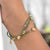 The Garden of Eden Layered Bracelet features three layered strands, hand-strung with mixed green glass beads and accented by seed shaped 18K gold-plated stainless steel beads. Finished with a 1.3” gold-plated stainless steel extension chain for adjustable length. Total length: 6.5” + 1.3” extension